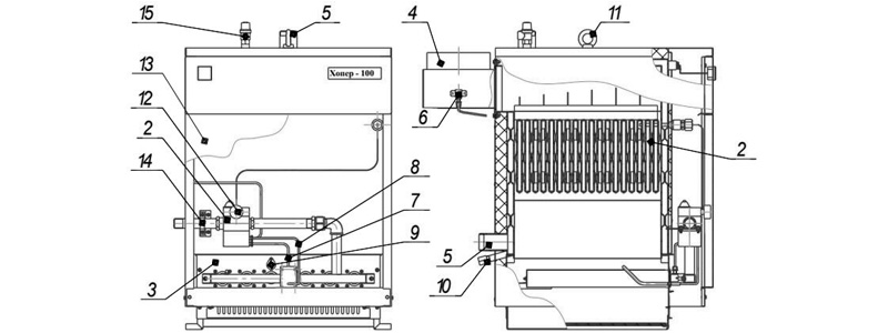 9. Глазок для розжига 10. Сливная пробка 11. Рым-болт 12. Регулятор температуры 13. Дверка 14. Патрубок присоединения к газопроводу 15. Предохранительный клапан . |